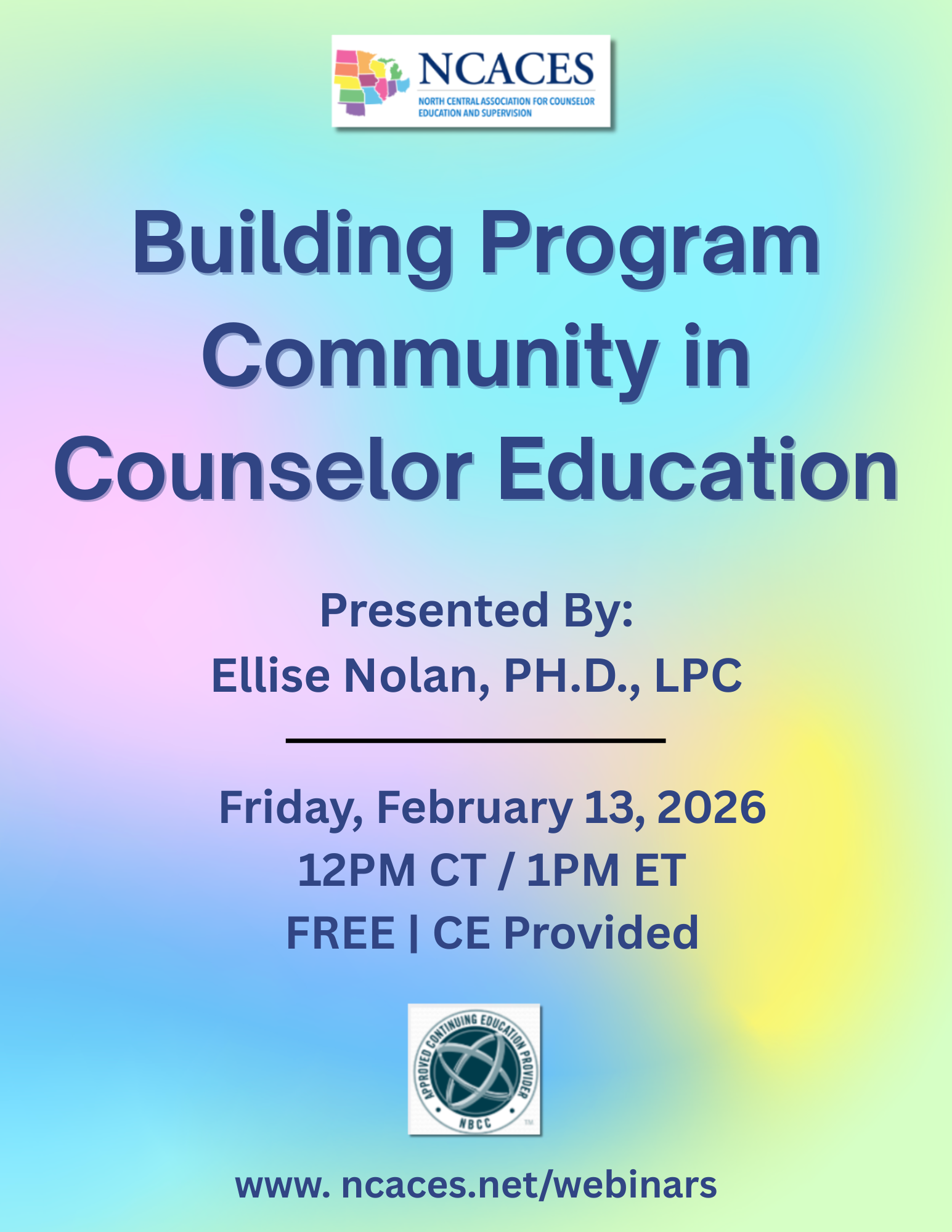 North Central Association for Counselor Education and Supervision (NCACES) has been approved by NBCC as an Approved Continuing Education provider ACEP No. 2074. Programs that do not qualify for NBCC credits are clearly identified. NCACES is solely responsible for all aspects of the program.